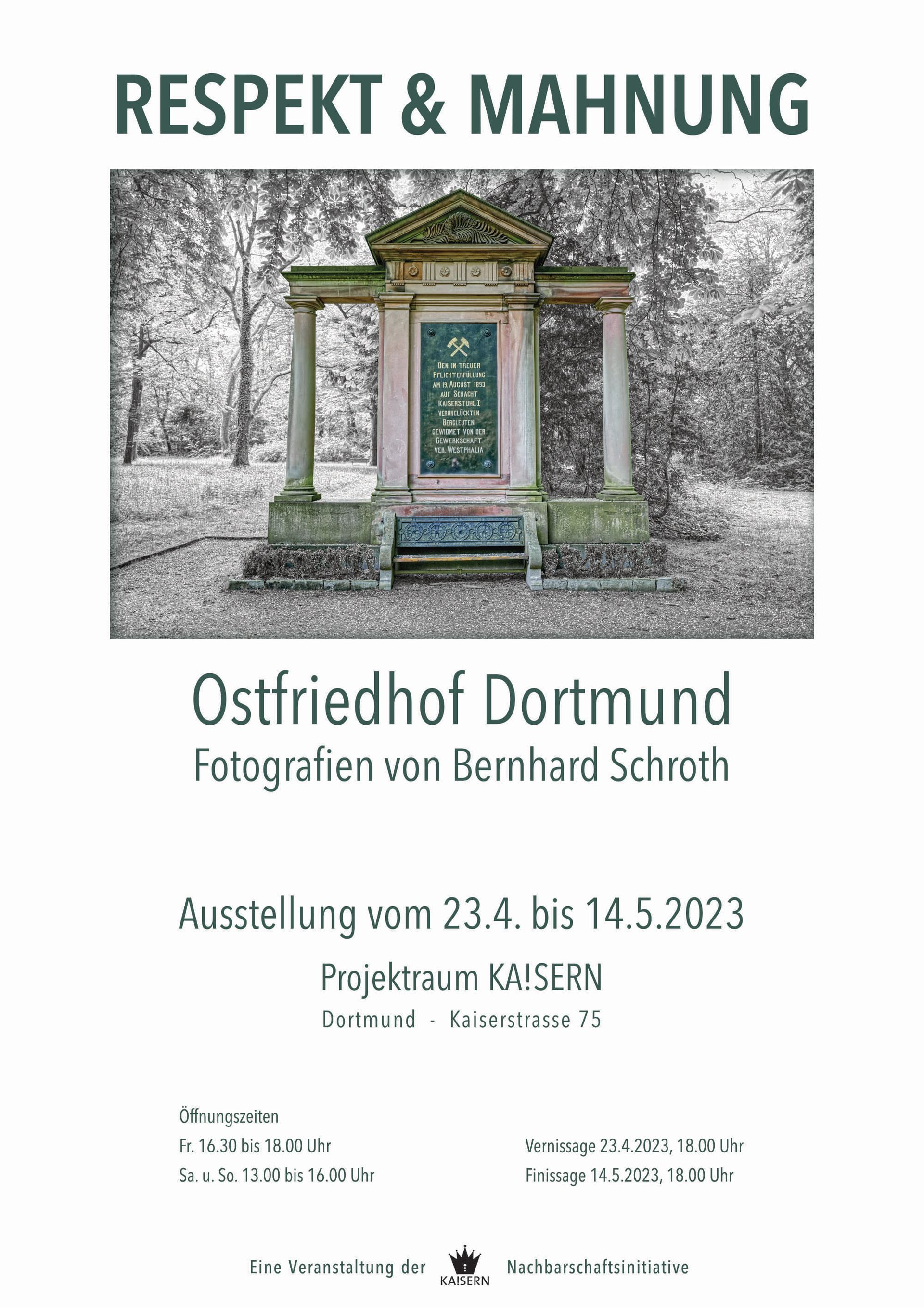 Verbunden mit dieser Themenwoche präsentierte ich vom 23. April bis zum 14. Mai 2023 zehn ausgewählte Fotografien meiner Bildserie vom Ostfriedhof Dortmund unter dem Austellungstitel RESPEKT & MAHNUNG. Die Ausstellung fand im Projektraum KA!SERN in der Kaiserstraße statt.