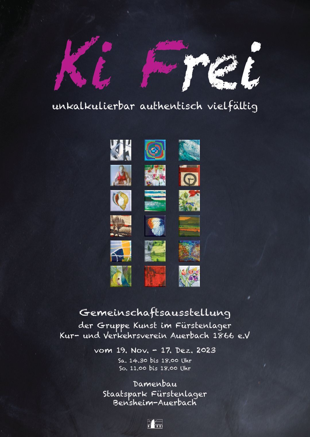 Am 19. November 2023 eröffnete die Gruppe "Kunst im Fürstenlager" des Kur- und Verkehrsvereins Auerbach ihre alljährliche Gemeinschaftsausstellung im „Damenbau“ des Staatsparks Fürstenlager. „Ki Frei“ lautete in diesem Jahr das Ausstellungsmotto.