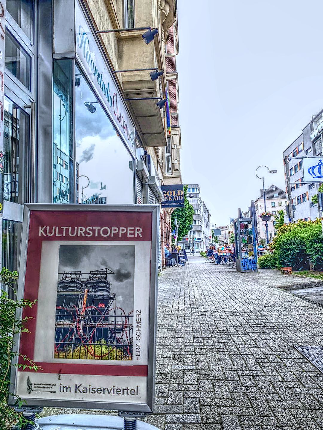 Passantinnen und Passanten, die geschäftig ihren Weg durchs Kaiserviertel nehmen, werden dennoch aus ihrem gleichförmigen Alltagstrott gerissen. Sie schauen auf, verlangsamen ihren schnellen Schritt und weichen überrascht dem aus, was sich ihnen freundlich in den Weg stellt. Es ist ein KULTURSTOPPER, der ihre Aufmerksamkeit einfordert.